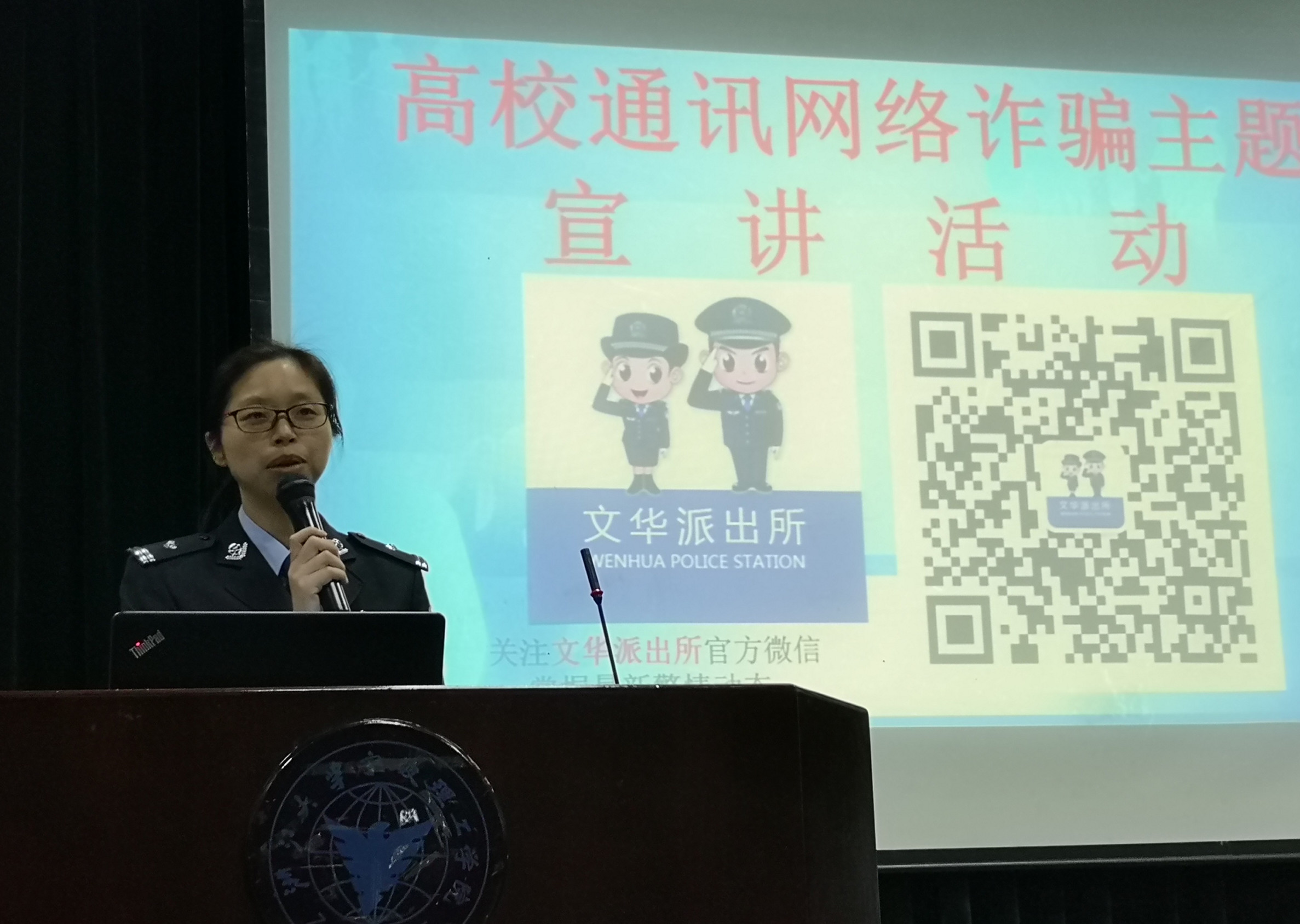 随着通信技术与计算机网络技术的快速发展,人们对于网络的依赖性逐步加大,同时必将产生个人信息保护的问题,为提升安全防范意识,有效预防、及时控制和妥善处置校园可能发生的各类诈骗,提升我校大学生应对诈骗事件的能力,近日在学校保卫处的大力支持下,信息、传媒、商学院联合组织了网络通信诈骗专题教育,特邀宁波市公安局胡江丹科长开展专题讲座。本次活动由信息学院辅导员杜明珠老师主持。