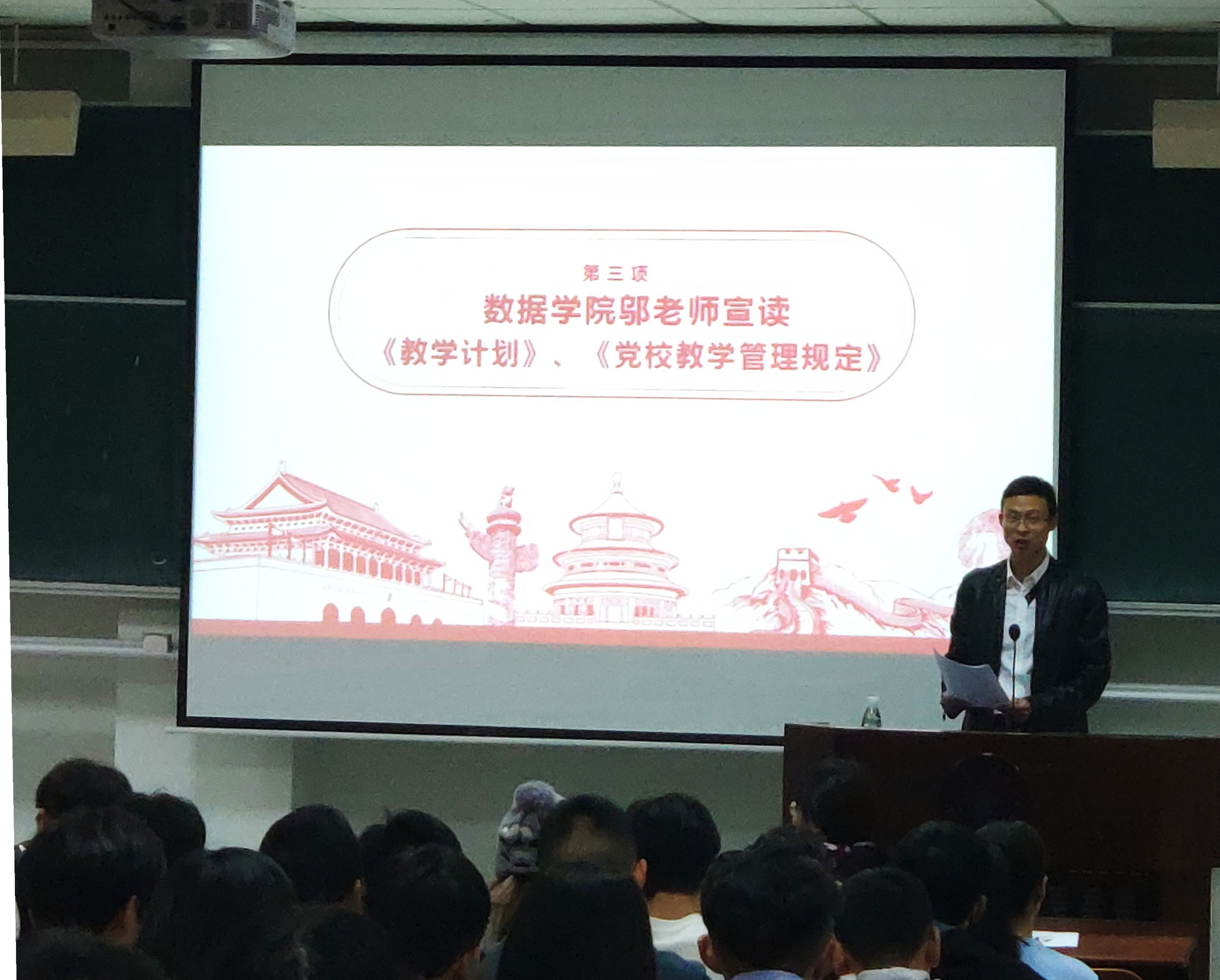 随后,数据学院邬旭东老师宣读了本期党校的教学管理规定和本期党校教学计划,并分别从培训内容和纪律两方面作了介绍和强调,勉励各位学员端正学习态度,认真学习党的理论知识。