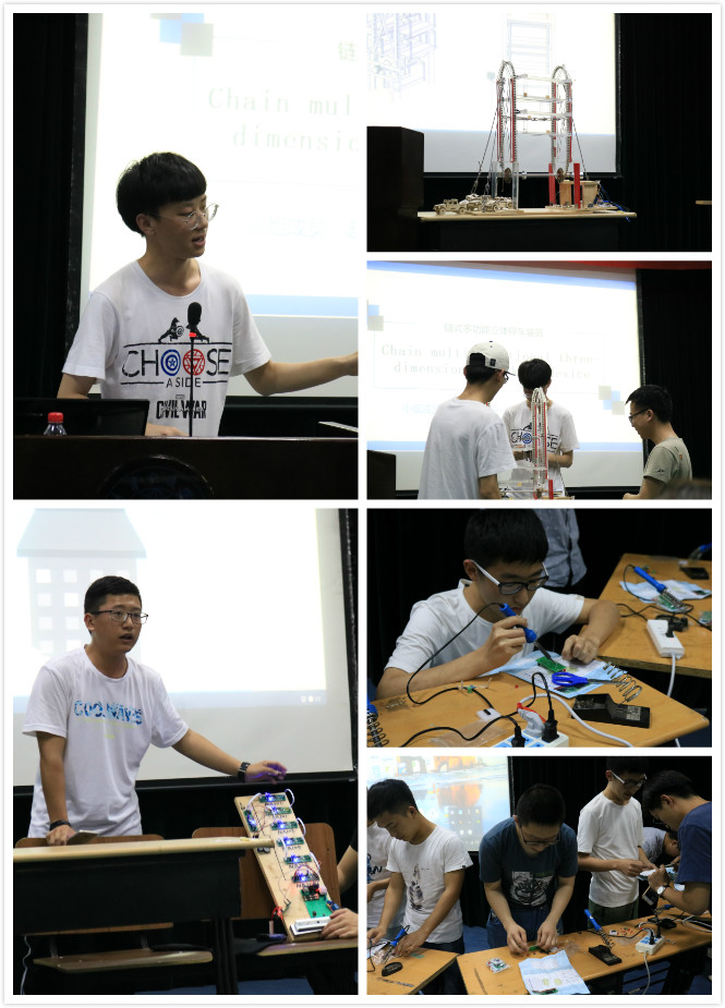 “知识改变命运 科技改变生活。”随着科学技术的发展,越来越多的科技成果在生活中得以应用,不仅为我们提供便利,同时也在各个领域实现利益和效益的双丰收,可以说,人类创造了科技,科技造就了人类。本次活动依次为我们展示了浙江省第三届机器人大赛取得一等奖的作品----三叶草机器人、链式多功能立体停车装置、电动平衡车。台下的同学也主动提出自己的疑问及其想法,活动间隙时,还邀请了同学到台上来体验焊接活动。
