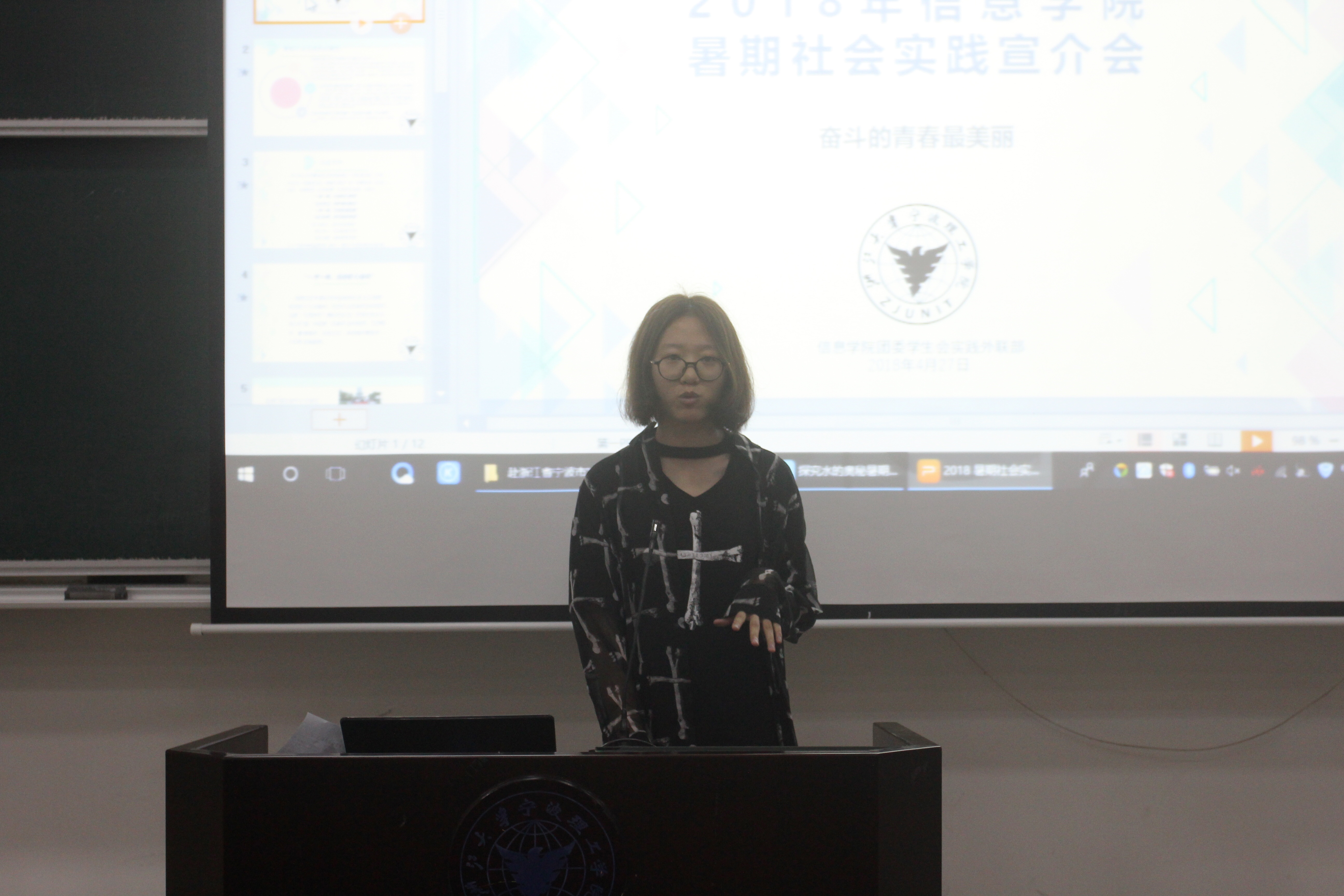在主持人开场白过后,宣介会正式开始。首先,由龚欣欣老师讲解了暑期实践的重要性和必要性,实践可以锻炼自己的能力,认识到自身的不足,增加自己的社会经验,通过实践来提升自己;实践可以培养吃苦耐劳的精神,这种精神在日程学习的生活中会起到很大的作用;实践可以培养沟通能力,培养同学之间团队合作的能力。接下来实践外联部部长于佳铭同学对暑期社会实践方向做了说明,并根据去年的暑期社会实践进行了具体实践讲解。紧接着,由去年优秀代表分享了他们的经验,非遗调研小组代表郭梦娜同学指出实时数据很重要,调研问卷的发放时间很关键,影响到调研的效果。关于创新,俞洪伟同学认为提出好的创意很重要,不过能把创意运用到实践中去,成功的完成的社会实践很难,在实践期间,学生可以边实践边学习,给自己定目标,如每天发微博、新闻稿、照片等。叶夏云同学也说,要保证每天的时间都要有目的性,不然这一天可能不知道干了些什么。为了顺利的完成实践,吴长聪同学说学好专业知识也是非常重要的,有助于学生完成暑期实践。参加暑期实践会有些意外的收获,徐铭萱同学就在支教期间收获了与孩子们的友谊。