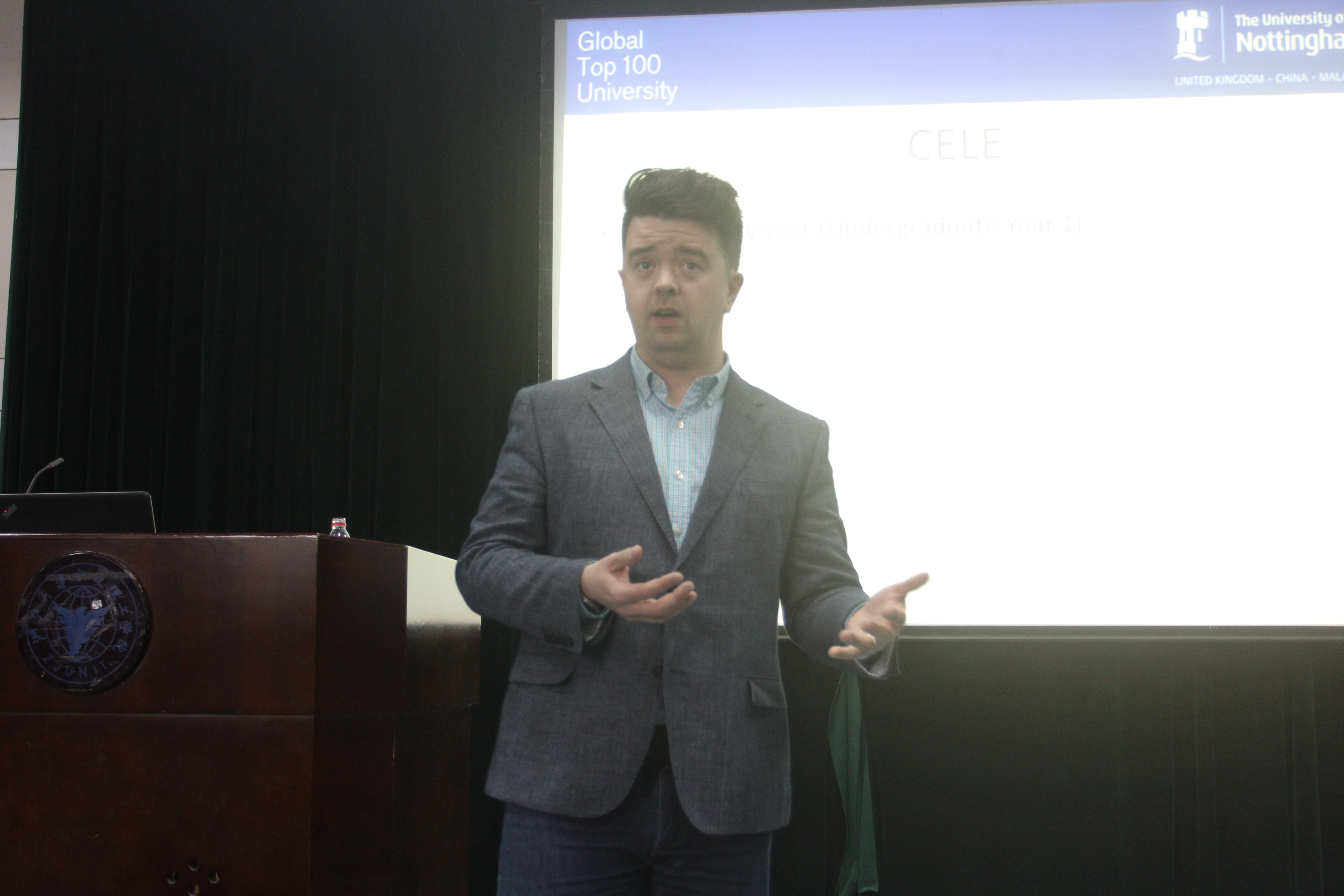 首先,傅晓宇老师对宁波诺丁汉老师们的到来表示了热烈的欢迎。随后,傅老师通过她身边的案例为同学们讲述了英语学习及能力的重要性。讲座伊始,David老师幽默的风格,丰富的表情,生动的讲解,一开场便吸引了在座的同学们,David老师从听、说、读、写全方位为同学们讲解如何学习英语,并剖析了雅思考试中的注意事项和应考要点;最后组织同学们两两一组,通过角色扮演的形式体验了雅思考试的氛围,现场尝试该如何正确与他人交流,提高口语能力。