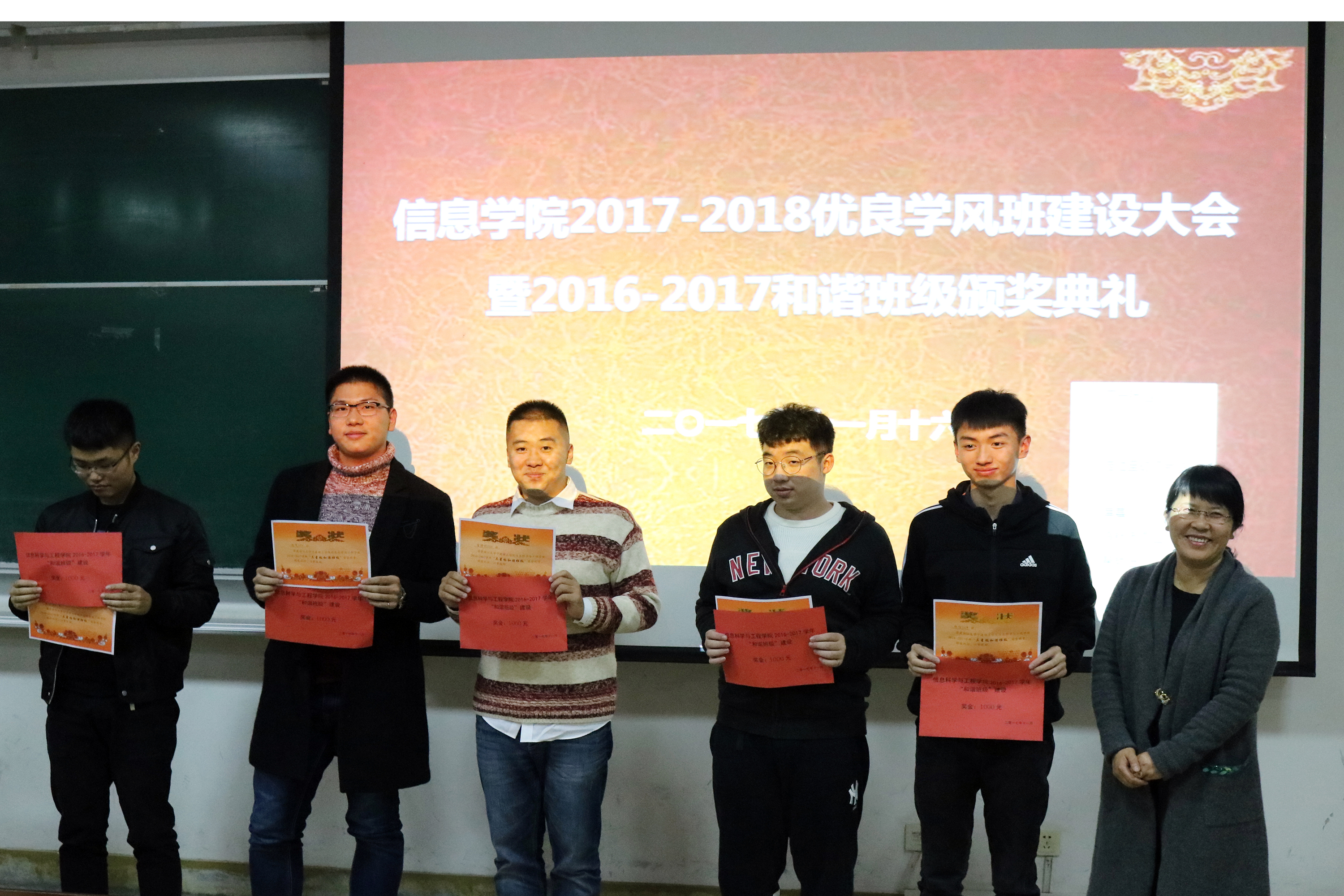 会议伊始,由徐益亮老师向同学们介绍了本年度的学风工作情况,包括学院基本情况、学风建设规章制度、学生学业预警制度以及学科竞赛和学术活动,同时介绍了定期召开工作例会,抽查到课情况,辅导员督查课堂等主要做法,得到一定成效,同时发现了班级出勤率差异,晚自习出勤率低,学习态度等存在的问题并提出对策。随后徐益亮老师对接下来的工作开展部署,内容涵盖优良学风建设,和谐班级建设,组织开展班会,认真准备申报材料,还重点强调了班级荣誉感。第二项议程,由龚欣欣老师宣布优良学风班与和谐班级名单,并由傅老师和龚老师为他们颁奖。紧接着通信141班长陈扬与电信162班长林裕强分别作班级工作总结汇报——简介班级概况,反思存在的不足和对未来发展的计划。