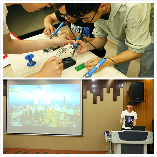 首先,由来自电信152班的杨顺杰同学为大家进行单片机讲解,杨顺杰同学表示电子设计其实就在我们身边,单片机并没有想象中的那么难,所有人都可以从零开始学习。紧接着,电气161班的田聪同学为大家介绍他们的KT板纸飞机项目,“一张KT板,折成童年的样子,轻轻一推就能载着梦想飞上蓝天。”第三位嘉宾杜焕狄同学将智能小车的故事带给大家,并与同学们分享他参赛时的趣事,还邀请有兴趣的同学上台操作小车。活动高潮,杨顺杰学长带领几位对焊接有兴趣的同学进行流水灯的焊接活动。最后,车载智能HUD通过银幕呈现在大家面前。最后,通信141的周祥同学为在座的同学介绍了先进实用的科技,还让我们了解到他们的创业情况。