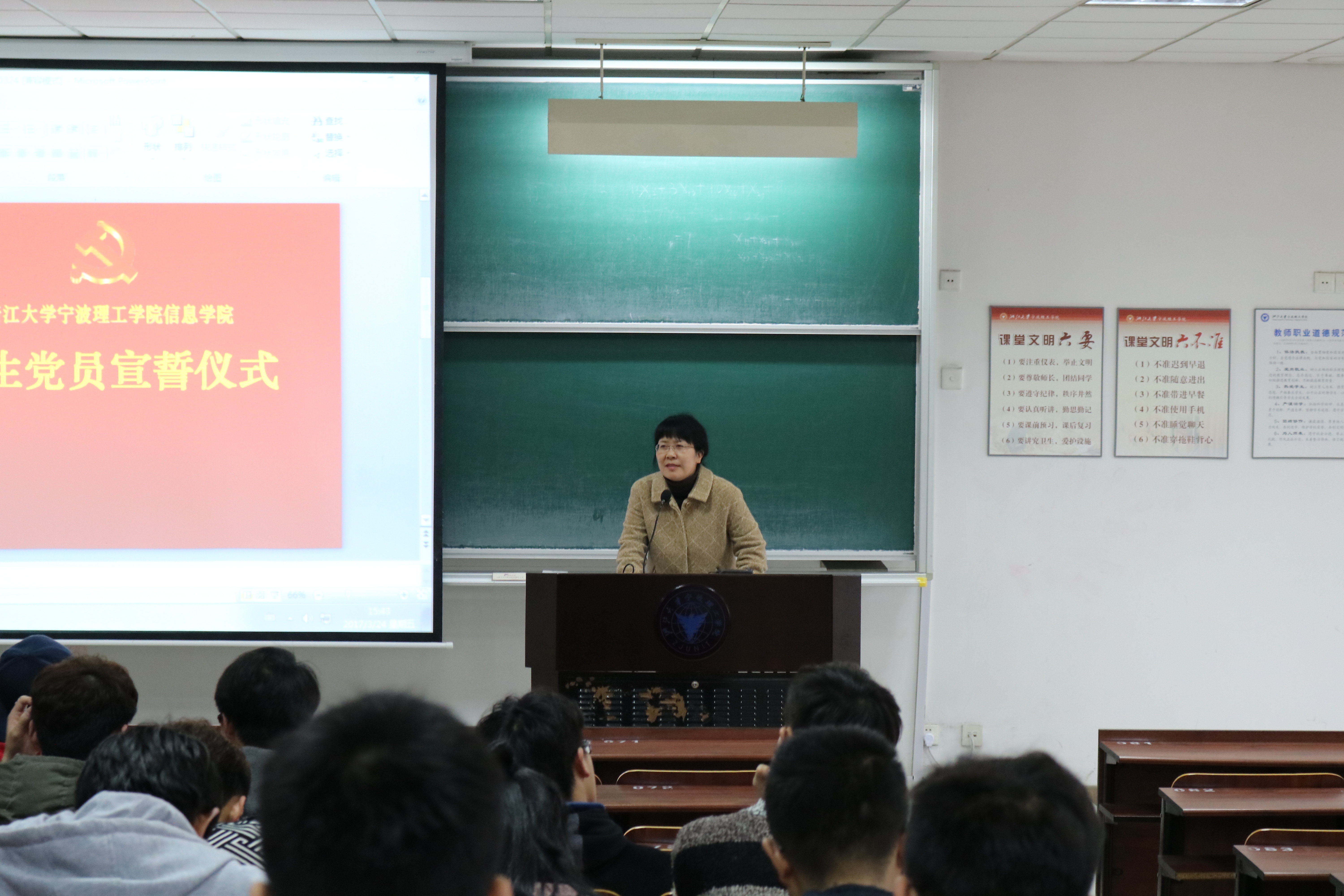 会议的第一项议程是新一批党员入党宣誓仪式。与会老师以及学生党员代表为各位新党员郑重地佩戴党徽,新党员们在鲜红的党旗下,字字铿锵宣读了入党誓词。随后,新党员代表王茹同学上台发言,表明作为一名党员的态度和决心。仪式的最后,党总支副书记傅晓宇老师对新发展党员以及台下所有党员和学生干部提出了殷切希望,同时,傅老师对全国高校思政工作会议精神和浙江省高校思政工作会议精神进行了传达,针对夏宝龙书记讲话“十要”精神进行了深入阐述,以此勉励在座党员和学生干部坚定理想信念、提高政治素养,增强责任意识、做好本职工作,主动学习实践、发挥模范作用,更加强调作为一名学生党员要“在党爱党、在党言党、在党为党”,积极投入“双百双进”、“美丽浙江建设”的行动中去,用自己的实际行动践行党员的义务。入党宣誓仪式结束后,杜明珠老师、徐益亮老师、龚欣欣老师就学风建设、文明寝室建设、团学活动等工作在会上向全体党员和学生干部作了通报,对本学期的工作做了布置。