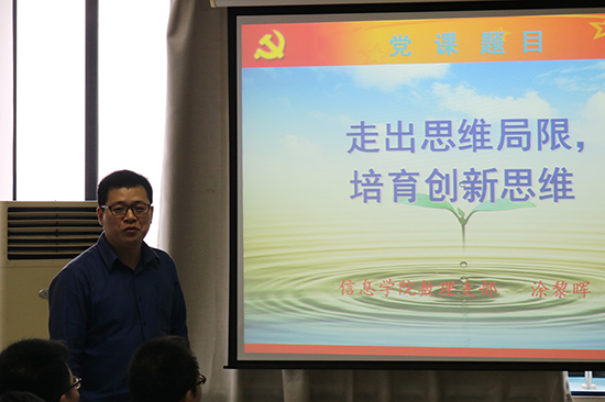 随后,教工组微型党课开始比赛,各位老师们就创新思维,做好“分内事”,创新与求是,“两学一做”等主题发表自己的看法,并进行生动的讲解。