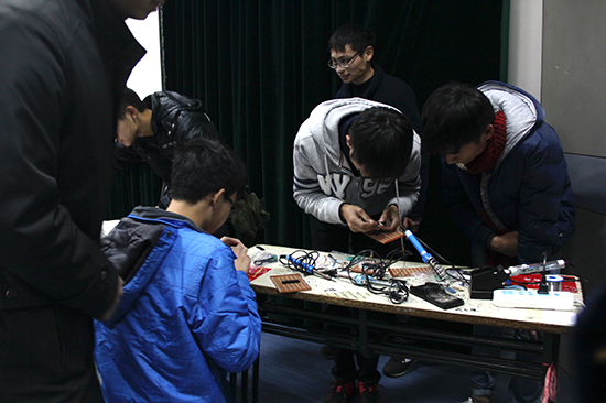 首先,王德诚同学结合汪峰用四轴飞行器递送钻戒求婚、小伙用四轴飞行器送月饼等社会热点,深入浅出地讲解四轴飞行器的原理,同时还和现场观众分享了自己制作四轴飞行器时的趣事。单片机的应用由李奕阳同学主讲,他在过程中展示了蓝牙遥控型智能小汽车、能识别水果的冰箱等高科技产品,同学们在台下聚精会神,兴趣盎然。接着各式各样吸引人眼球的科技制作品一一登台亮相,例如声控灯,手摇发电装置等。最后,最令人期待的"Dancing robot"惊艳全场,可爱的机器人在台上表演了唱歌,跳舞以及各种高难度的动作,引得同学呼声一片。最后由无线电协会组织进行了流水灯的焊接,同学们踊跃参与。讲坛现场座无虚席,有不少同学就讲解内容以及展示的高科技提出了疑问,全场互动连连,同学们主动提出要体验所展示的高科技的请求,表现出了对科技十足的兴趣。