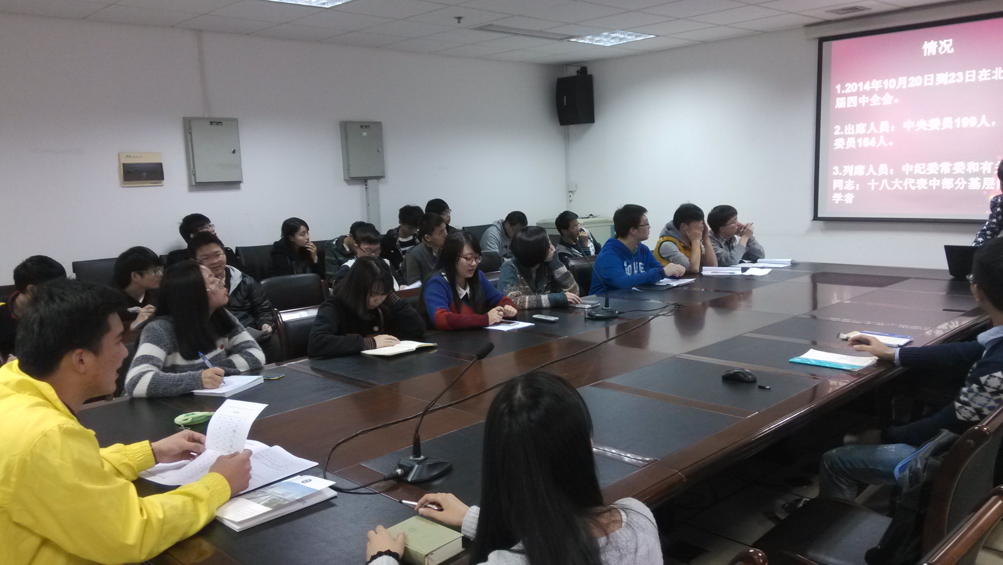 首先支部陈俊标同志介绍了十八届四中全会召开时间、出席人员与内容,然后点明了十八届四中全会的总目标:做到两个坚持一个实现,六个重大任务和问题。本次的报告详细介绍了关于宪法,法律实施、监督、司法、法治信仰、司法队伍、党的领导等方面内容,诠释了十八届四中全会的亮点。之后,支部进行了分组讨论和交流,大家一致认为,本次大会专题讨论依法治国问题,这既是法治中国的必由之路,也是一个富强、民主、文明、和谐中国的必由之路。