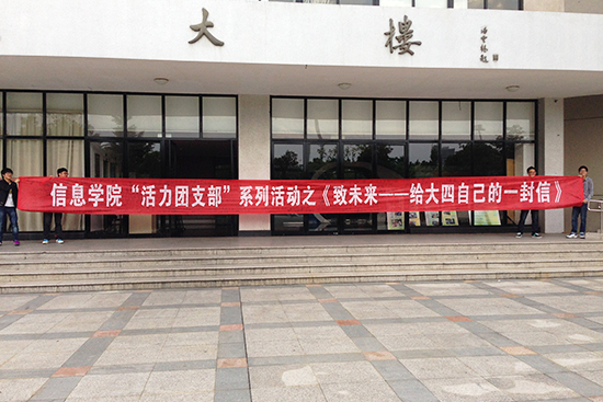 下午四点开始,各个班级陆陆续续来到石麟大楼,每一个同学都带着给自己的一封信,信有厚有薄,信封上面写好自己的班级、学号以及姓名。同学们拿着信,郑重的投入到信箱中,并在横幅上签上自己的名字。信件将会在2013级学生毕业时发还给每一位同学。