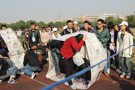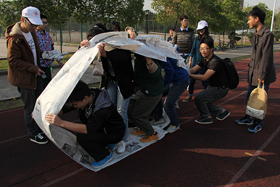活动共分成十个小组,以小组为单位相继开展了“无敌风火轮”、“解手链”,“链接加速”,“盲人方阵”等5个活动。其中给人印象最深的是“无敌风火轮”活动,活动中每个小组在规定的时间内用胶水将废旧报纸粘贴成圆环,四个成员在圆环中半蹲着前进,过程中虽然每个组都出现了各种意外情况,但是大家坚持走到了终点处,第五队因为在粘贴报纸的时候出现了问题,在其他队都到达终点的情况下,在其他获胜队伍的帮助下,他们坚持不懈的走到了终点。而在“盲人方阵”游戏中,大家在双眼被蒙蔽的状态下,团队合作,利用窍门,又快又好的组成了“3*4”的方阵。