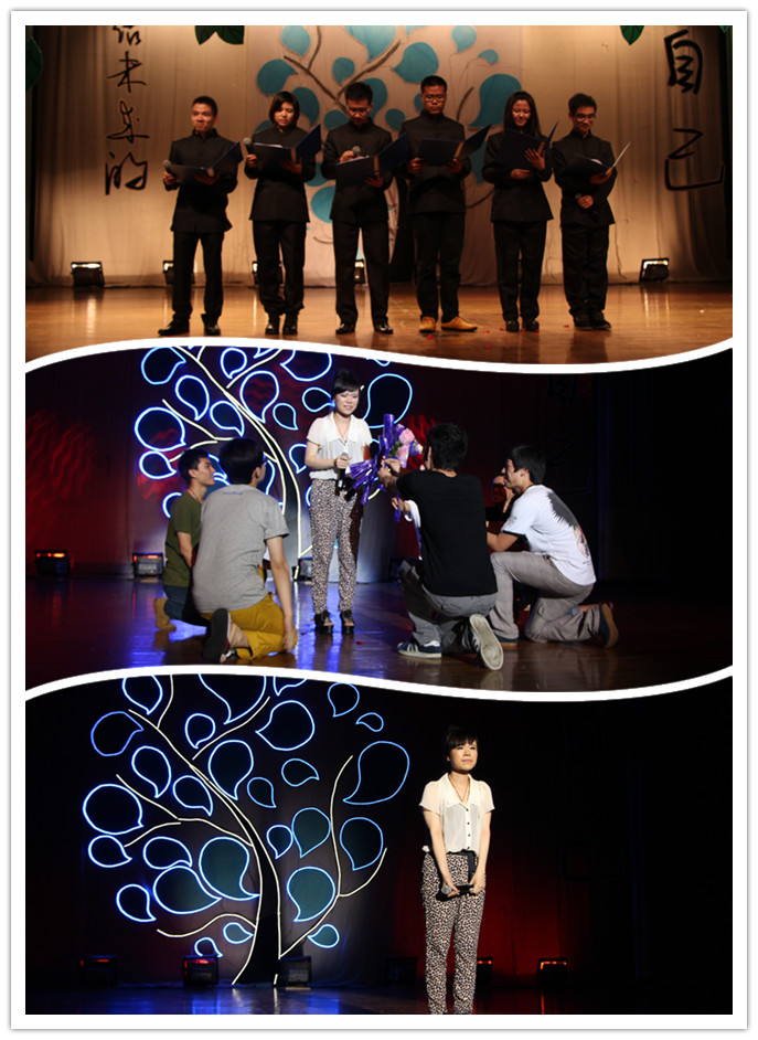六月,对2009级毕业生而言,虽是离别的季节,但更是新的开始、新的征程。我们以“给未来的自己”主题晚会为毕业生祝福。晚会在计算机101班沈泽涵同学六架电钢琴的激情演奏中开场,共分为三个篇章,分别为《礼物》、《那些年》和《致青春》。主持人“六六大顺”组合幽默、新潮的台词,演员们曼妙的舞姿、悠扬的歌声、深情的朗诵、真实的表演都赢得了场内600余名观众接连不断的掌声,尤其是胡超、郑洪、朱勇、徐斌、王海波五位老师的一曲《明天会更好》,更是引发了全场同学的欢呼与喝彩,将晚会推向高潮。晚会在《给未来的自己》的歌声中、在低年级学生“学长学姐,毕业快乐”的集体祝福中、在“阳光信息,永争第一”的口号声中落下帷幕。