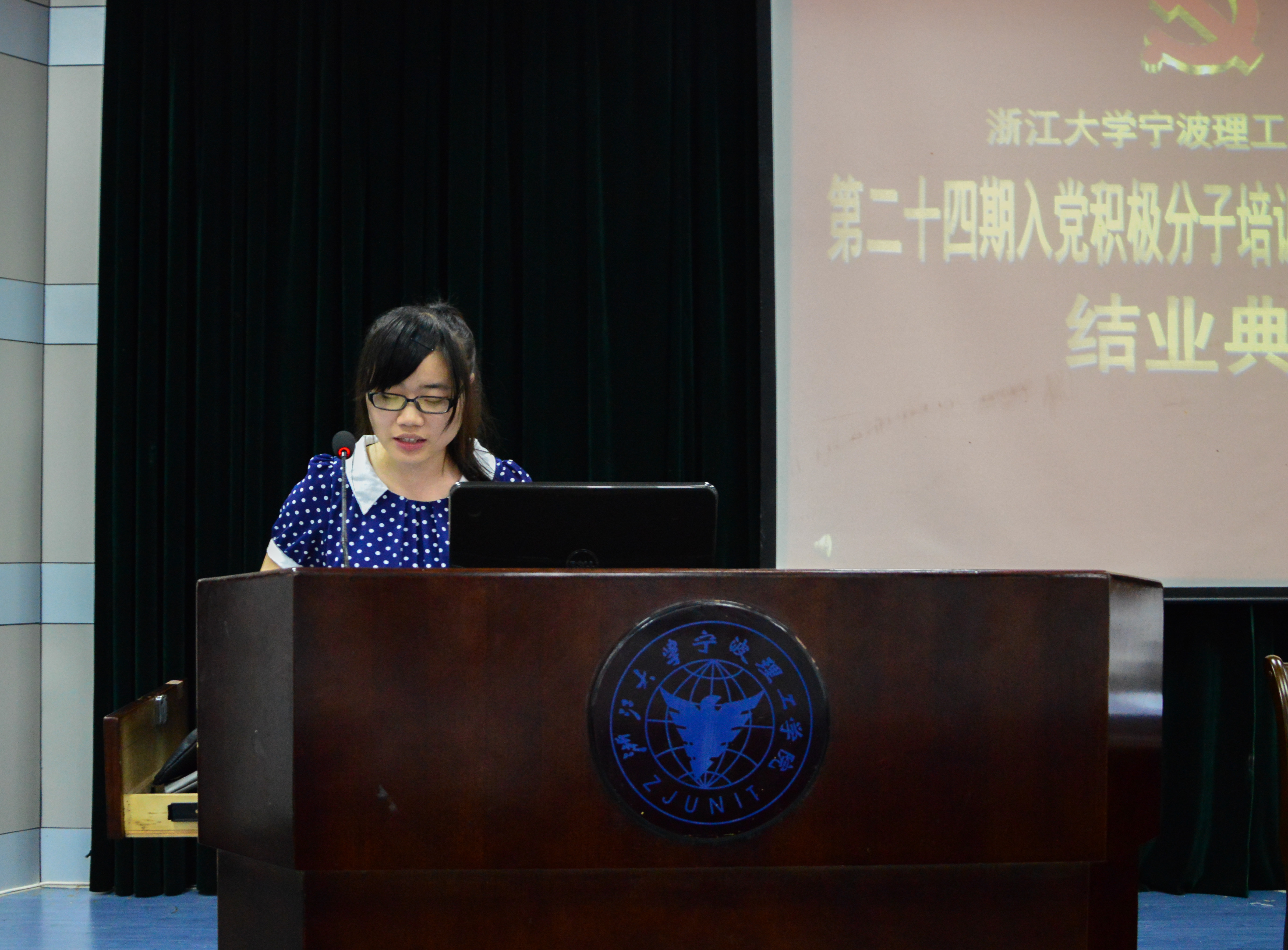 在庄严的国歌声中,结业典礼拉开了序幕。吴新林老师简单介绍了本次党校学习概况,随后姜华老师宣读优秀学员名单,主席台就坐的老师为优秀学员颁发了证书。范淑倩同学作为优秀学员代表进行了发言,她认为通过党校的学习强化了自己的理论知识,端正了入党动机,今后要不断学习强化自己对党的认识,争取早日入党。