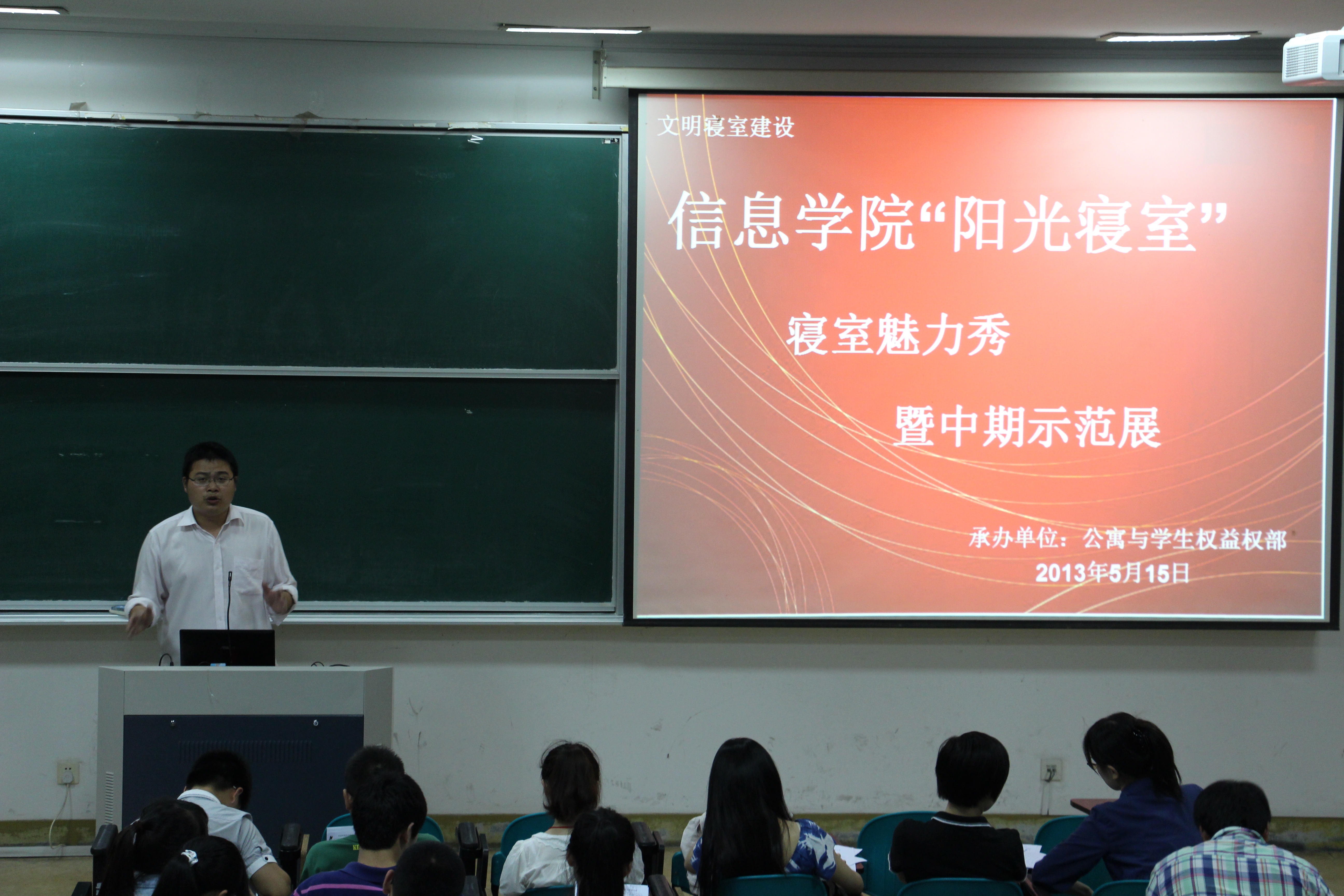 为加强文明寝室建设,必赢76net线路于5月15日在sc103举行了第三届“阳光寝室”中期示范展暨寝室魅力秀。学院辅导员王海波老师,各班班长、团支书,学院学生会主要学生干部及参赛寝室人员参加了本次评选活动。