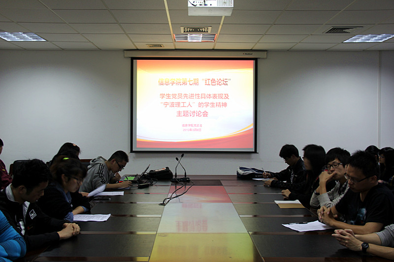 5月8日晚6时,石麟大楼602会议室,座无虚席,气氛热烈。这里正在举办必赢76net线路 “红色论坛”第七期主题讨论活动,讨论会以 “‘宁波理工人’的学生精神”和“学生党员先进性的具体表现”为主题。学院党总支组织委员、思政主管吴新林老师主持,本期预备党员培训班学员和团学干部代表参加了讨论会。