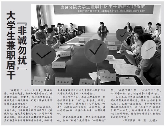 面试有25名学生参加,江东区白鹤街道团工委和信息分院团委共同对挂职学生进行面试,面试采用职来职往的形式,面试的同学每人首先进行简单的自我介绍,之后11位社区代表进行提问,在首轮中有6位同学直接被6个社区看中。第二轮,剩下的社区代表和待定同学进行相互选择,双方都同意的可以直接达成协议,最后的将会由街道进行统一安排。经过近两个小时的选拨,最终选出14名优秀学生干部赴白鹤街道担任兼职社区主任助理,另外选出2名候补人员。这14名同学将于6月初正式挂职,开展相应的社区工作,挂职为期一年。主要工作内容为政策宣讲;配合街道社区团支部,结合社区实际,开展团建活动;协助加强青少年思想道德教育;协助街道社区开展社区服务工作;协助街道社区开展社区文体活动;开展和谐社区、和谐社会宣传工作,营造社区和谐社会建设氛围。