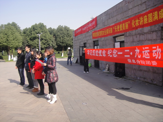 为了共同回顾75年前那个不平凡的日子,为了缅怀那些投身民族救亡运动的爱国青年,12月9日12:30,信息分院第七期团校成员于露天广场隆重集会,顺利举行了“重温誓词铭责任”——“牢记历史使命,纪念一二·九运动”团校实践活动。信息分院团委副书记倪玮担任了本次活动的主持人。