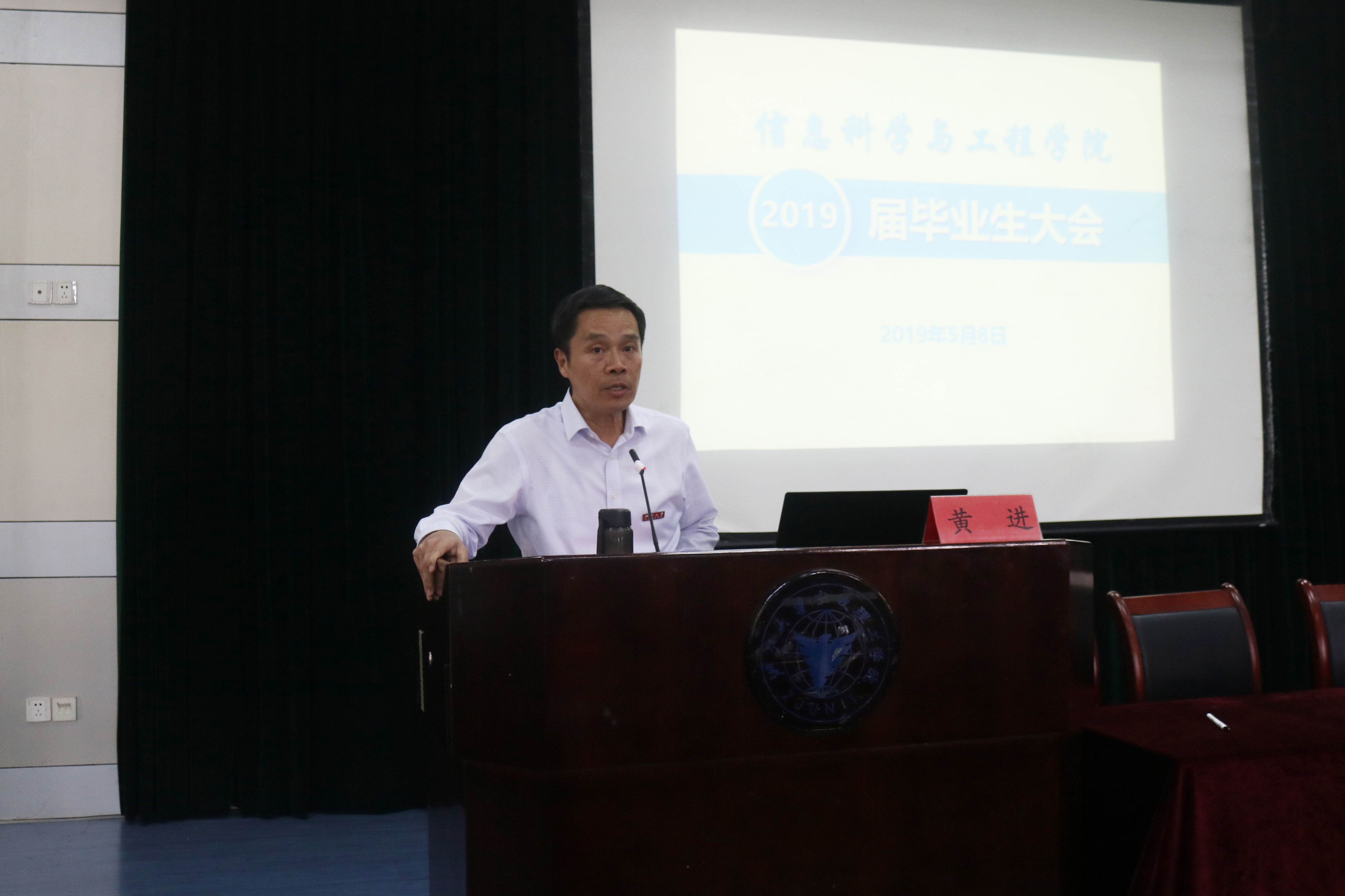 会上,学院院长黄进对毕业生们业已取得的成绩和为学院做出的贡献表示肯定和感谢。之后,黄院长对毕业生们提出了“三心”的要求,即“进取之心”,以追求完美的精神完成大学四年最后的教学环节;“责任之心”,充分重视个人就业;“奋斗之心”,毕业不是学习的终点,而应该是新的学习阶段的开始。最后黄院长表示,虽然从空间距离上,毕业生们将渐行渐远,但学院、老师会一直关注和陪伴大家!他希望即将成为校友的同学们,毕业后能心系母校,关注和支持学校和学院的发展!
